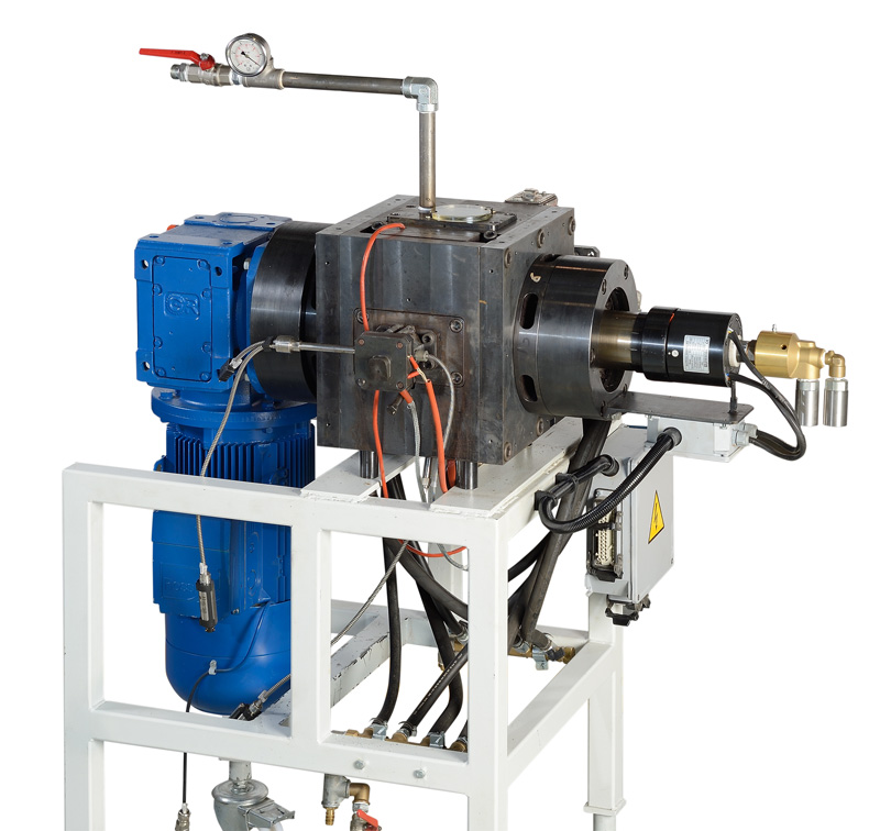 Looking to the cross section, the red colored melt enters in the mixing chamber, spread over the rotor, in a clockwise direction and fills up the mixing chamber up to a certain circumferential level, depending on the processing target. Downstream, the pumping section provides to discharge the melt through the exit die (extrusion die, Nexxus DEGASSING or others). |