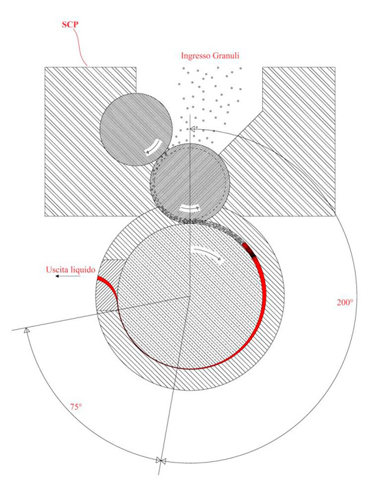 Guardando la sezione del modulo MELTING, si vede il solido termoplastico in particelle cadere dall’alto nella tramoggia SCP dove il materiale viene preso e spinto contro il rotore caldo del processore, che ruota in senso destrogiro. Il canale di fusione, statico, ricavato nella parete interna della bussola, è convergente per favorire la compattazione del materiale e accompagnare la riduzione del volume conseguente alla fusione. Appena entra in contatto col rotore Il materiale viene fuso istantaneamente e il melt trascinato verso la zona di pompaggio. |